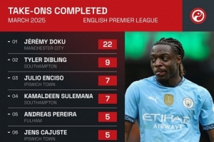 体育资讯4月1日讯 Squawka统计了英超3月份球员的成功过人数据,并列出榜单,曼城边锋多库22次断层居首,迪布林9次第二。值得一提的是,多库的过人次数在英超球队中也能排在第三位,仅次于曼城和南安普顿。